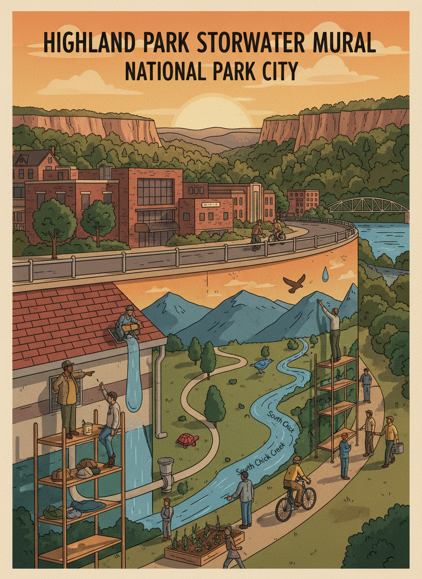 Paint a large stormwater education mural on a retaining wall in Highland Park near Main and Willow streets, using art to explain how rain flows through the neighborhood to South Chick Creek. The mural would trace the path of a raindrop from rooftop to storm drain to creek, showing how everyday actions affect water quality. Highland Park has flooding issues tied to impervious surfaces and undersized storm drains. A mural that makes stormwater visible and understandable would build community awareness while beautifying a blank wall. The project would involve local artists and neighborhood youth in the design and painting process.