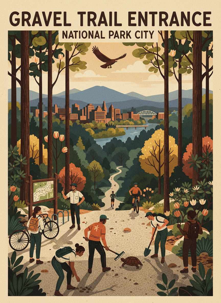 A new gravel trail entrance into Stringer's Ridge Nature Preserve from Spears Avenue on the south side, providing direct access for North Shore residents who currently must drive or walk a long detour to reach existing trailheads. The entrance would include a simple gravel path, a trail map kiosk, and a small bike rack. Stringer's Ridge is one of Chattanooga's most beloved urban green spaces, but access points are limited. Residents on Spears Avenue and nearby streets can see the ridge from their porches but face a half-mile walk to the nearest trailhead. This new entrance would serve hundreds of households and reduce trailhead parking congestion.