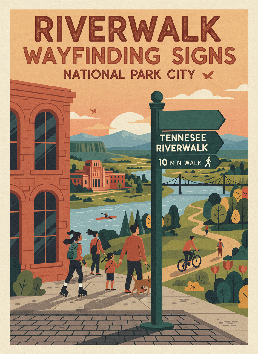 Install a series of wayfinding signs guiding pedestrians from the Chattanooga Public Library downtown to the Tennessee Riverwalk, a walk of less than 10 minutes that most library visitors don't know about. The signs would use the city's existing wayfinding design language and include walking time estimates. The downtown library is one of the city's most visited public buildings, and the Riverwalk is one of its best public spaces — but they feel disconnected. Simple directional signs at key decision points would help thousands of library visitors discover the trail, especially families and tourists who don't know the area.