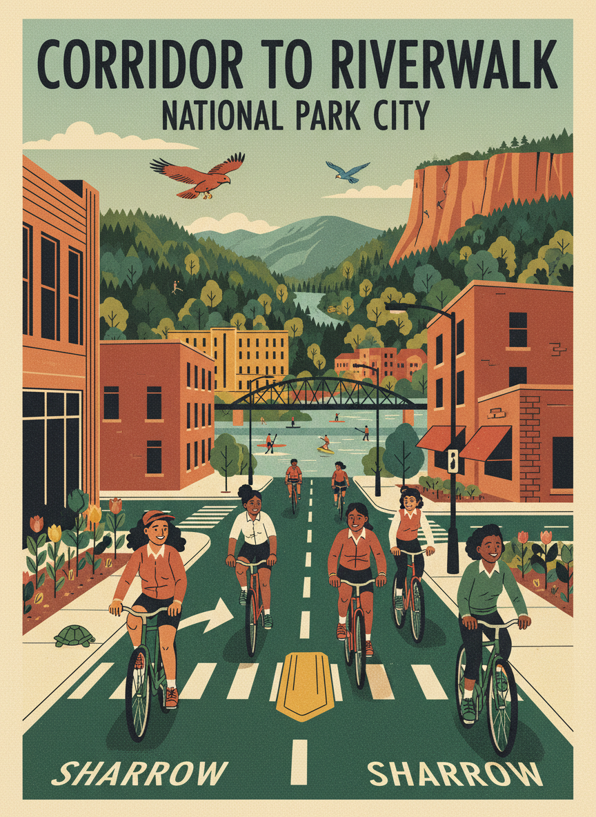 Establish a bike-priority corridor on Main Street linking the Southside district to the Tennessee Riverwalk, using painted bike lanes, shared lane markings, and traffic calming features. The corridor would give cyclists a comfortable, direct route from the restaurants and shops of Southside to the riverfront trail. Main Street is already lower-traffic than parallel routes, making it ideal for bike priority treatment. Sharrows, green-painted conflict zones at intersections, and speed tables would signal to drivers that bikes belong here. The corridor connects two of Chattanooga's most vibrant areas and would encourage car-free trips between them.
