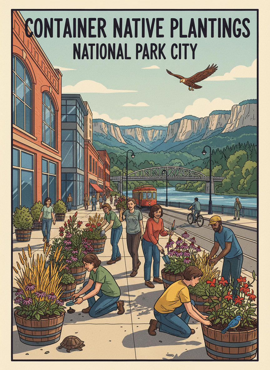 Place large container planters with native grasses, wildflowers, and small shrubs along the Broad Street sidewalks downtown, adding greenery and pollinator habitat to the city's main commercial corridor. The containers would use a curated palette of native plants that bloom in succession across seasons. Broad Street is Chattanooga's signature downtown street, but its sidewalks are mostly hardscape. Container plantings are a fast, flexible way to add green without tearing up pavement. Using native plants rather than ornamental annuals creates real ecological value — supporting pollinators and demonstrating that native landscapes can be beautiful in urban settings.