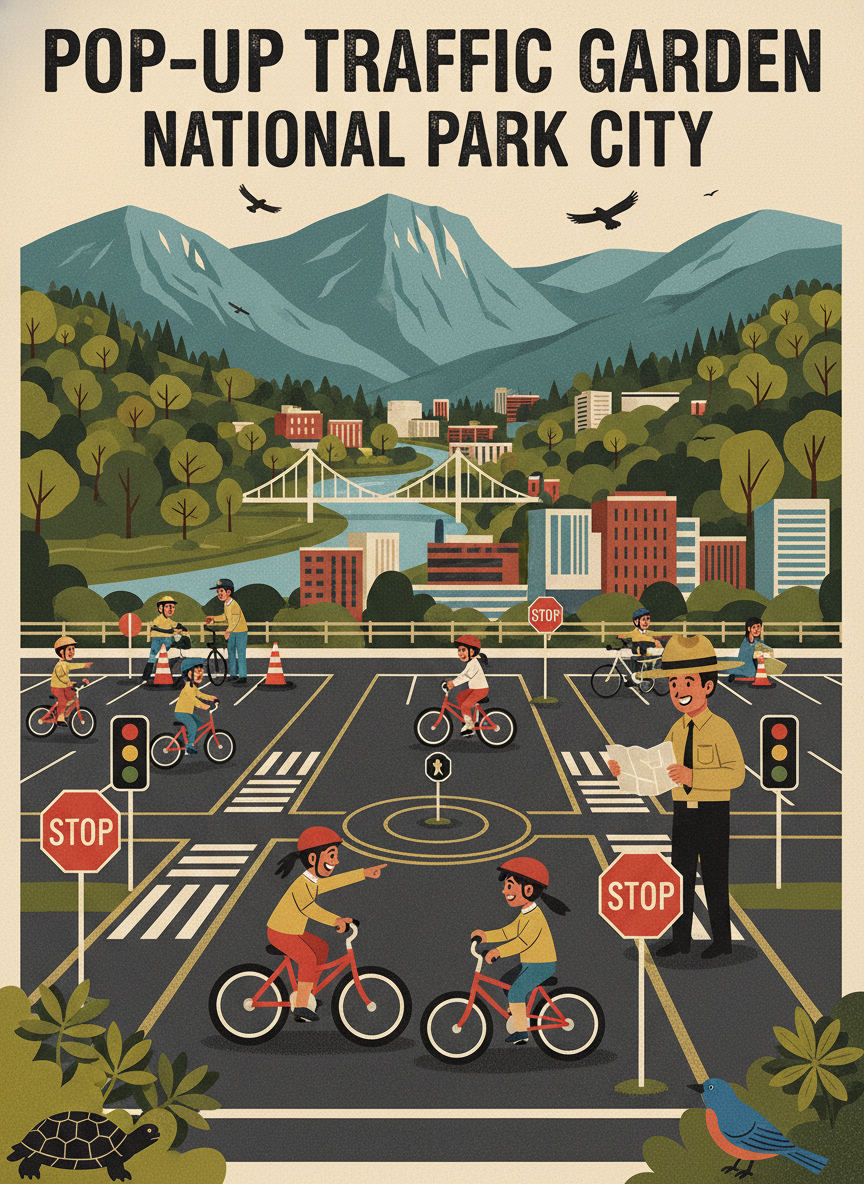 Create a pop-up traffic garden in the Warner Park parking lot on weekends, teaching children bike safety through a miniature streetscape with painted roads, stop signs, crosswalks, and traffic signals. Kids ride their bikes through the course, learning rules of the road in a safe, car-free environment. Traffic gardens are proven tools for building children's confidence and safety awareness on bikes. Warner Park's large parking lot is underused on weekends and perfectly flat for painting. The pop-up format means the garden can be deployed seasonally without permanent changes to the lot.