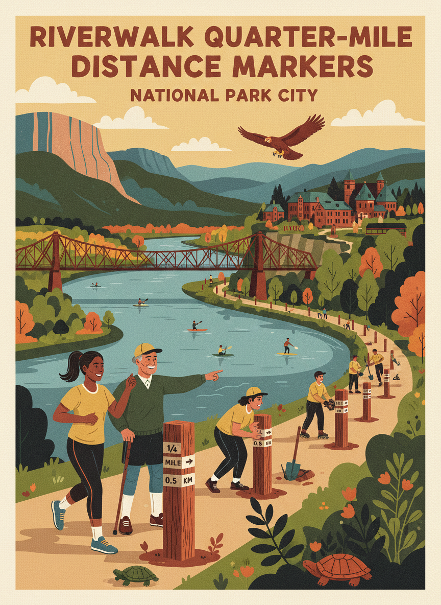 Install quarter-mile distance markers along the Tennessee Riverwalk from the Walnut Street Bridge to Bluff View Art District, helping runners, walkers, and physical therapy patients track their distances on this popular stretch. The markers would be simple, durable posts with distance noted in both directions. This section of the Riverwalk is heavily used by fitness walkers and runners who currently rely on phone GPS or guesswork to track distance. Physical therapists at nearby Erlanger hospital regularly prescribe walking distances for patients recovering from surgery — clear markers would make the Riverwalk a rehabilitation resource.